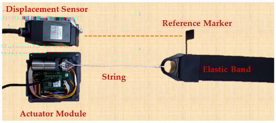To verify the actuation model of the active soft brace, a setup was designed consisting of Faulhaber© MC3001 motion controller and DC motor module to twist the four Ø 0.4 mm Dyneema fishing strings of 20 cm (200 mm) attached to the motor shaft and elastic band. A laser displacement sensor (Keyence lk-g152, Mechelen, Belgium) was used to measure the actual position, as shown in Figure 4 and Figure 5.