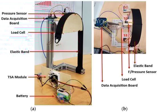 Testbed for contact force modeling. (a): Isometric view showing the actuator module, battery, bands and data acquisition board; (b): Top view with three single point pressure/force sensors.