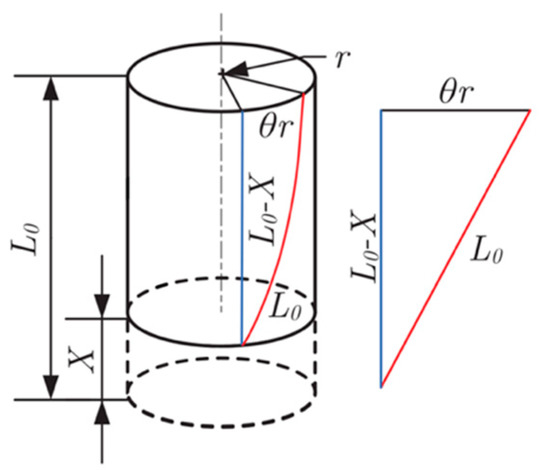 To effectively control the twisted string actuation mechanism, it is important to estimate the contraction of the string length. This could be implemented with an external linear displacement sensor, but since we aim at realizing a low-cost/low-complexity system we aim at estimating the string length based on the rotation of the actuator shaft θ that can be measured through an encoder attached to the motor. The actual length of a twisted string can be derived from the string’s helix geometry as shown in the kinematic scheme presented in Figure 4 [35]. Using simple geometry considerations, the contraction of length can be written as a function of twist angle θ can be written as: