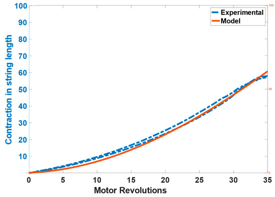 The results of the contraction of the string length calculated through the model and measured from the laser displacement sensor can be seen in Figure 6. The model tracks the position effectively with the RMSE of 0.17386 cm (1.7386 mm).