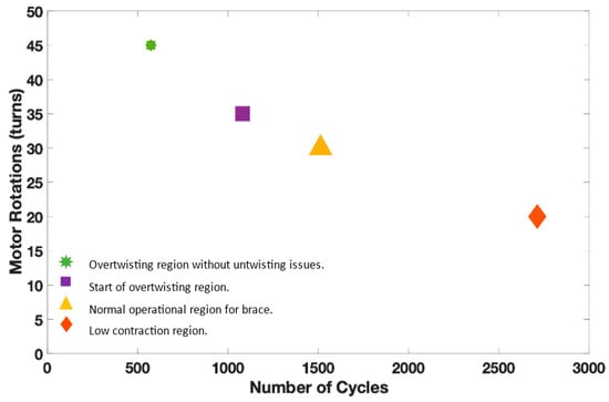 These numbers of turns were chosen based on the twisting regions, i.e., low contraction, over twisting, etc. The low contraction region which represents up to 20 turns showed a higher life cycle of 2712 compared to other regions. The maximum contraction limit without the overtwisting of the strings (35 turns) represents the start of the over twisting phase with the lifecycle of 1080. Overtwisting may cause untwisting issues, the limit where overtwisting is possible without untwisting issue is represented by 45 turns. Therefore, the active soft brace operates below the overtwisting region. Figure 7 demonstrates the life cycle of the TSA in different twisting regions. It can be observed that the life cycle reduces for higher contraction of the strings.