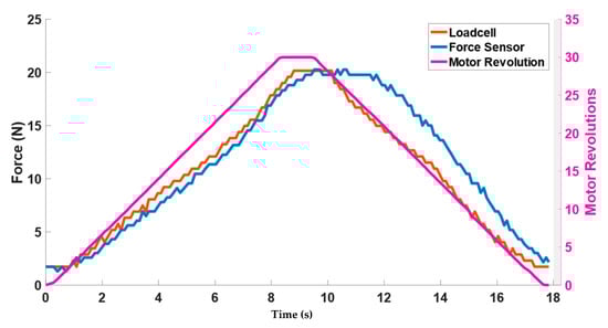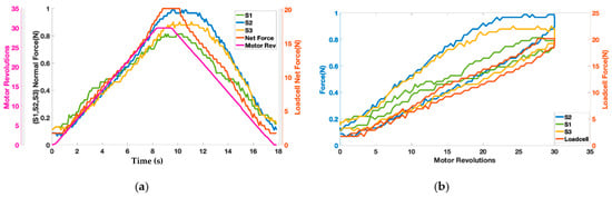 The motor twisted the string up to 30 revolutions resulting in pulling the elastic band and exerting the force on the wooden block shown in Figure 3. Figure 8a shows the change in force values of three Singletact pressure/force (S1, S2, S3) and loadcell force with respect to motor revolutions. The motor revolutions are displayed with a pink line with pink axis on the left while the forces of the single point pressure/force sensors are displayed with respect to black axis in green (S1) blue (S2) and yellow (S3). The value of the forces measured through the force/pressure sensors are quite low compared to the net normal force measured through loadcell (net force in red with right y-axis as reference). This shows trend/co-relation between the forces measured from the Singletact pressure/force sensors and net normal force measured through the loadcell. Sensors’ hysteresis are also plotted in Figure 8b.