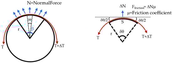 The testbed can be modeled as a belt-pulley contact model (see Figure 9). Consider a belt wrapped over the pulley with a wrap angle β. The aim is to find the relation between the normal force measure at the segment of the wooden dummy (i.e., the force measured at point using single-point pressure/force sensors) with respect to net normal force that is acting on the wooden dummy (equivalent to the one measured by loadcell). Wrap angle β of the pulley can be divided into small segments of angle δθ. If the pulley is holding the belt and is in an equilibrium state, the sum of forces acting in x- and y-direction is equal to zero shown by Equations (1) and (2).