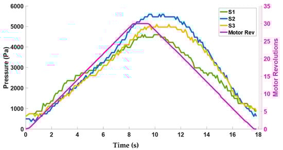 Figure 11 plots the pressure calculated through the force values of the sensors S1–S3 with respect to actuator motor revolutions. It can be seen from Figure 11 that the amount of pressure that the band exerts is between the range of 0–6 KPa. These values of pressure are safe to be applied to the spine considering the pressure study performed by [36] in which a rigid brace exerted pressure through pads in the range of 0–8 KPa at different locations of the spine.