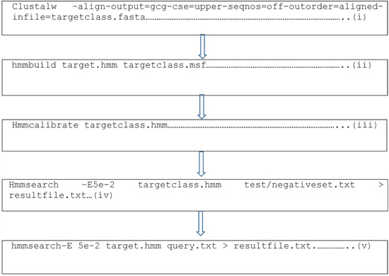 Representative codes for the generation of the parental putative antimicrobial peptides from the HMMER algorithm, a machine learning tool, where (i) indicates the generation of Clustal for the training datasets which yields the msf file; (ii) generates the hmm file from the msf file using hmmbuild; (iii) calibrates the hmm profile; (iv) searches for matching motifs in the test or negative datasets; and (v) searches for motifs in proteomes of other organisms for the discovery of new antimicrobial peptides.