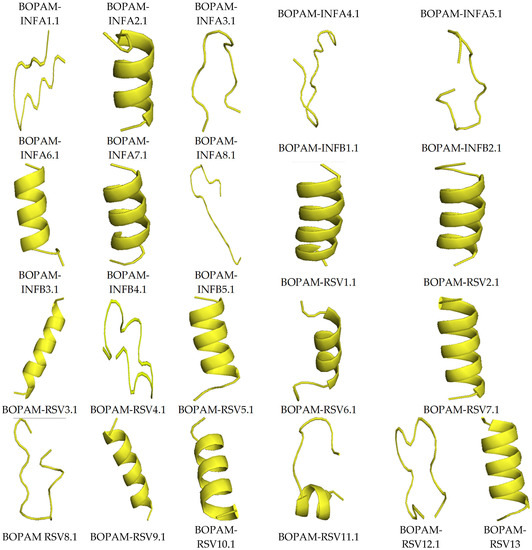 The antiviral AMPs were also subjected to site-directed mutagenesis, where lysine of BOPAM-INFA1, 2, 4, 6, and 7 at position 13 was substituted for arginine, while BOPAM-INFA3, 5, and 8 had glycine at position 7, which was substituted for threonine. BOPAM-INFB1 and 2 had histidine at position 5, which was substituted for arginine, while BOPAM-INFB3 had cysteine at position 12, which was substituted for serine. BOPAM-INFB 5, 6, and 4 had leucine at positions 8 and 15, which was substituted for methionine and phenylalanine, respectively. Lastly, BOPAM-RSV1, 2, 3, 4, 6, 7, and 8 had serine, threonine, valine, and tyrosine, which were mutated at position 3 with asparagine, while BOPAM-RSV5, 9, 10, 11, 12, and 13 had threonine and isoleucine which were substituted at position 13 with arginine.