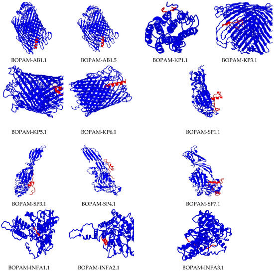 The interaction studies indicate that the BOPAM-SPs bound pneumolysin at the extracellular site of Streptococcus pneumoniae at the N-terminal domain; BOPAM-KPs bound the extracellular outer membrane protein receptor of Klebsiella pneumoniae at the N-terminal domain; and BOPAM-ABs bound the extracellular C-terminal domain of the outer membrane protein receptors of Acinetobacter baumannii. In the same manner, the binding affinity of the antiviral AMPs occurred at the exposed regions of their receptors, with BOPAM-INFAs binding the nucleoprotein at the N-terminal domain of influenza A virus and BOPAM-INFBs binding the nucleoprotein of influenza B virus at N-terminal domain, while BOPAM-RSVs bound both chain A proteins of respiratory syncytial virus at the N-terminal domains.