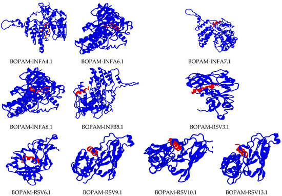 All mutated anti-influenza A AMPs returned higher binding scores than the respective parental AMPs, where improved binding efficacies were recorded for the AMPs against the nucleoprotein of influenza A virus except for BOPAM-INFA5.1. Only BOPAM-INFB5.1 had a high binding score against the influenza B virus nucleoprotein, while BOPAM-RSV3.1, BOPAM-RSV6.1, BOPAM-RSV9.1, BOPAM-RSV10.1, and BOPAM-RSV13.1 all had improved binding scores against respiratory syncytial virus chain A.