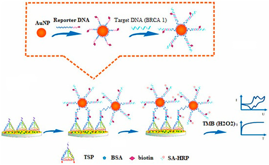 Tian and associates have investigated AuNPs for electrochemical sensing (label-free) of microRNA-21 (miRNA-21) via a redox indicator. These sensors exhibited high sensitivity, selectivity, and reproducibility in blood serum samples [114]. Feng and coworkers have developed an electrochemical AuNP-based biosensor for sensitive and selective detection of BARC-1 to form a sandwich-type assembly (Figure 2) [115].