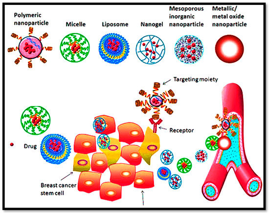 We already know that anticancer medications can be delivered to the body via liposomes to either lessen the harmful effects of the drugs when administered on their own or lengthen the circulation time and effectiveness of the treatments [167]. According to the evidence given below, we think it is possible to direct aqueous contrast-enhancing chemicals that are loaded in liposomal carriers to the breast tissue and then use computed tomography to differentiate between normal and tumorous breast tissue. In this regard, Yonghong Song and co-workers developed emodin-based liposomal NPs. As it is reported in the literature that emodin possesses strong anti-cancer activity, but its efficacy is somehow compromised owing to the poor solubility and non-targeted delivery. Therefore, the specificity of the emodin was improved by incorporating it into the liposome’s lipid bilayer. Furthermore, the hydrophobic layer of the liposomes was concurrently loaded with high-performance ferromagnetic iron oxide nanocubes. Results concluded that magnetic field targeting leads to the efficacious and sensitive targeted killing of BC cell lines [150]. Yuko Okamoto et al. developed paclitaxel-based liposomes for the reason that paclitaxel is an insoluble anti-cancer drug and has issues of low solubilization and poor pharmacokinetics. Therefore, a liposomal formulation of paclitaxel within its aqueous core without adding organic solvents finally showed potent activity against BC cell lines [168]. Similarly, Snehal K. Shukla and her research team developed metformin hydrochloride (Met) encapsulated within liposomal vesicles via thin-film hydration technique by active and passive loading of drug-loaded lipid film. The metformin liposomal formulation leads to advanced therapeutic efficacy, i.e., an increased therapeutic outcome at the minimized dosage and profound apoptosis-induced activity in BC cells [169].