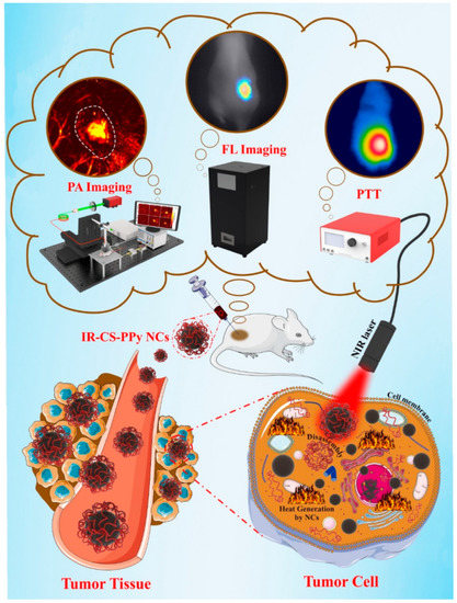 A multimodal polymeric contrast agent and imaging techniques have the potential to make important advances in the area of biomedicine [180]. To address this, in order to produce a theragnostic agent for dual-modal imaging using both fluorescence (FL) and photoacoustic (PA) imaging, IR783 attached chitosan-polypyrrole nanocomposites (IR-CS-PPy NCs) were created. The in vitro photothermal findings show that IR-CS-PPy NCs may effectively destroy MDA-MB-231 BC cells when exposed to an 808 nm NIR laser. The in vivo PTT investigation showed that IR-CS-PPy NCs completely destroyed the tumor tissues, preventing any further regrowth [180]. Figure 6 shows a schematic of IR-CS-PPy NCs used in dual-channel photoacoustic/fluorescence imaging-guided photothermal treatment.