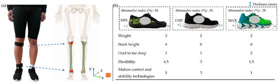 The sensor placement (a) and the minimalist index and sub-scores for each item (b). Note: MINs: the minimalist shoes; CONs: the conventional shoes; MAXs: the maximalist shoes.