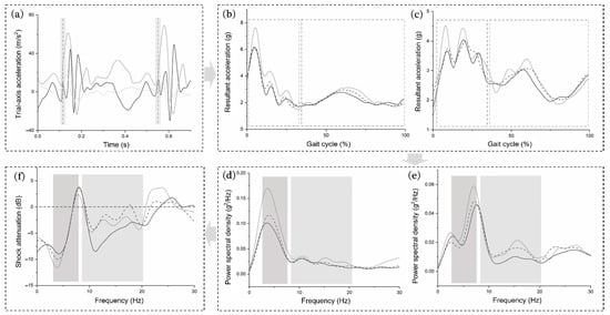 Graphical representation of the acceleration data process technique in the time and frequency domains. These include raw time-series tri-axis acceleration data (a); resultant acceleration from the distal (b) and proximal (c) tibia; power spectral density from the distal (d) and proximal (e) tibia; shock attenuation from the distal tibia to the proximal tibia (f). Note: black denotes maximalist shoes, gray denotes minimalist shoes, and the dashed line indicates conventional shoes.