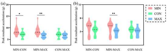 Violin plots of the Bonferroni comparisons for peak resultant acceleration between conditions in the distal (a) and proximal (b) tibia. Note: MINs: the minimalist shoes; CONs: the conventional shoes; MAXs: the maximalist shoes. * p < 0.05 and ** p < 0.01. The black dashed line represents the median, and the gray dashed lines above and below represent the third and first quartiles.