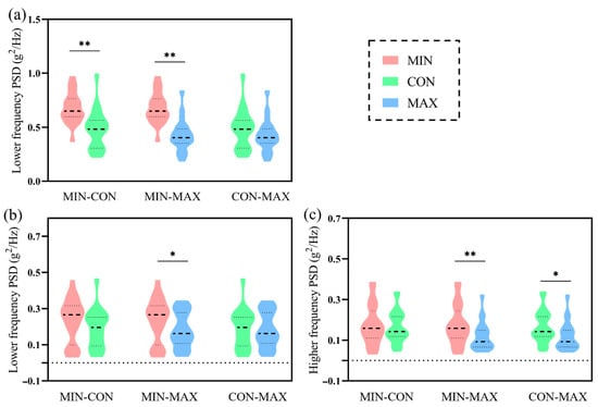 Violin plots of the Bonferroni comparisons for PSD between conditions in the distal (a) and proximal (b,c) tibia. Note: PSD: power spectral density; MINs: the minimalist shoes; CONs: the conventional shoes; MAXs: the maximalist shoes. * p < 0.05 and ** p < 0.01. The black dashed line represents the median, and the gray dashed lines above and below represent the third and first quartiles.