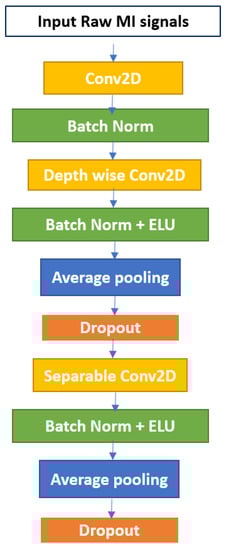 The first convolution layer uses 2D filters followed by a batch normalization. Batch normalization aids in the acceleration of training and the regularization of the model [44]. The second convolutional layer uses depthwise convolution followed by batch normalization and activation function in the form of an exponential linear unit (ELU), average pooling, and dropout. The third convolutional layer uses separable convolution. A simplified architecture of the EEGNet is shown in Figure 1.
