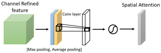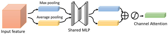 One of the attention modules is the Convolutional Block Attention Module (CBAM) described in [46], where the authors built a module to emphasize significant characteristics along the channel and spatial axes. Each branch may learn ‘what’ and ‘where’ to pay attention in the channel and spatial axes by using the sequence of attention modules (as shown in Figure 2). Because the module learns which information to highlight or hide, it efficiently helps the flow of information across the network. CBAM has two submodules: the channel attention submodule and the spatial attention submodule. In the channel attention submodule, the input features from the preceding block are concurrently transmitted to the average pooling and max-pooling layers. The features map generated by both pooling layers is then transmitted to a shared network, which is made up of an MLP with one hidden layer. In this hidden layer, a reduction ratio was used to reduce the number of activation maps which reduces the parameter overhead. After applying the shared network to each pooling feature map, element-wise summing is used to merge the output feature maps. Then, to generate the feature vectors that will be the input for the spatial attention submodule, the element-wise multiplication is used between the output feature map from the channel attention submodule and the input features map for the attention module. When calculating spatial attention, the channel axis average-pooling and max-pooling processes are used. As a result, a convolution layer is used to build an efficient feature descriptor. Both submodules are presented in Figure 3 and Figure 4.