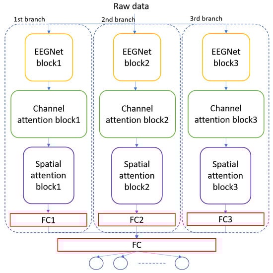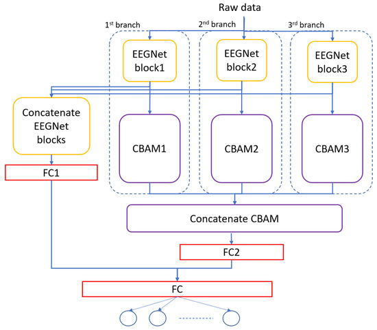 The architecture of the MBEEGCBAM is shown in Figure 5. It has three different branches, each branch has an EEGNet block, channel attention block, and spatial attention block followed by a fully connected layer. Each branch has a varied number of parameters to capture different features. Moreover, after the improvement shown by the fusion in medical signals and images [47,48,49], we investigate the effect of fusion of the output feature maps from EEGNet blocks with the output from the EEG-CBAM blocks to reduce feature loss and construct a comprehensive feature map. For that, we propose the FMBEEGCBAM model (Figure 6) that has the same blocks and connections as in the MBEEGCBAM model with an extra step. In this model, we add two concatenate layers: one after the EEGNet blocks and the other one after the CBAM blocks, then we flat and fuse both concatenate layers before using the fused layer as input into the softmax layer for classification. We test our models in BCI-IV2a and HGD, which are two benchmark datasets in MI EEG classification.