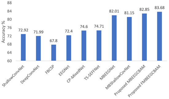 Using the two public datasets, we evaluate the performance of our models. Figure 7 and Figure 8 show how our methods performed against the SOTA models in the BCI-IV2a and HGD. From the figures, we can see that the proposed models achieve at least 8.14% higher accuracy than other baseline models in the BCI-IV2a. However, in HGD the improvement was by around 2% in both MBEEGCBAM and FMBEEGCBAM.
