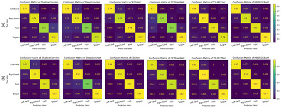 The average confusion matrices for all subjects on both datasets (a) the BCI-IV2a, (b) the HGD.