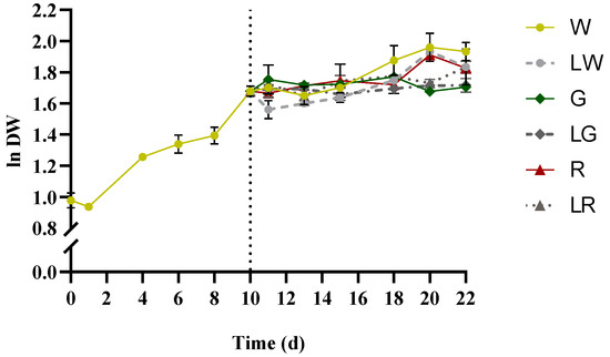 Growth curves of S. salina LEGE 06155, expressed as logarithm of dry weight (ln DW) versus time (per day). The vertical dotted line denotes the separation between phase I: treatment of W (white, 150 μmolphotons·m−2·s−1) (control), from 0 to 10th days (left) and phase II: LW (low white, 50 μmolphotons·m−2·s−1), G (green, 150 μmolphotons·m−2·s−1), LW (low green, 50 μmolphotons·m−2·s−1), R (red, 150 μmolphotons·m−2·s−1), and LR (low red, 50 μmolphotons·m−2·s−1) from 10th to 22nd days (right). The data points show average ± SD, n = 3.