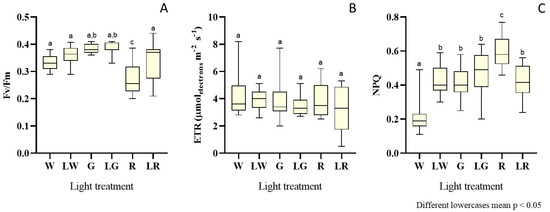 Box and whisker plots of the data of photosynthetic efficiency, for each light treatment: W (white, 150 μmolphotons·m−2·s−1) (control), LW (low white, 50 μmolphotons·m−2·s–1), G (green, 150 μmolphotons·m−2·s−1), LW (low green, 50 μmolphotons·m−2·s−1), R (red, 150 μmolphotons·m–2·s–1), and LR (low red, 50 μmolphotons·m−2·s−1) applied to S. salina LEGE 06155, considering Fv/Fm (maximum quantum yield in PSII) (A), ETR (electron transport rate) expressed in μmolelectrons·m−2·s−1 (B), and NPQ (non-photochemical quenching) (C). The horizontal line within the box indicates the median, boundaries of the box indicate the 25th and 75th quartile, and whiskers indicate the lowest and the highest values of the results. The lowercase letters denote statistically significant differences (p < 0.05).