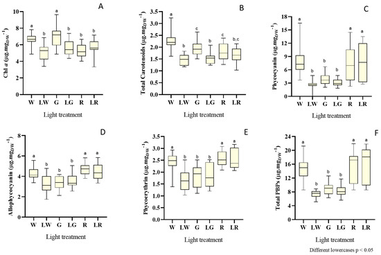 Box and whisker plots of pigment content, expressed in mg gDW−1, for each light treatment: W (white, 150 μmolphotons·m−2·s−1) (control), LW (low white, 50 μmolphotons·m−2·s−1), G (green, 150 μmolphotons·m−2·s−1), LW (low green, 50 μmolphotons·m−2·s−1), R (red, 150 μmolphotons.m−2.s−1), and LR (low red, 50 μmolphotons·m−2·s−1) applied to S. salina LEGE 06155, considering chl a (A), total carotenoids (B), phycocyanin (C), allophycocyanin (D), phycoerythrin (E), and total phycobiliproteins (F). The horizontal line within the box indicates the median, the boundaries of the box indicate the 25th and 75th quartiles, and the whiskers indicate the lowest and the highest values of the results. The lowercase letters denote statistically significant differences (p < 0.05).
