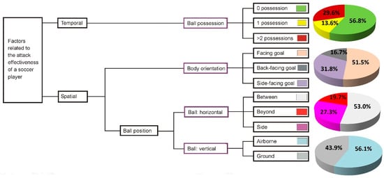 The analysis results of temporal and spatial factors related to goal-chance identification are shown in Figure 2. Compared to the outcomes of temporal efficiency from the previous study [], i.e., 69.3% of goals scored for zero-possession shots, 17.9% of goals scored after two or more possessions, and 12.8% of goals scored for shots after dribbling, the temporal branch of Figure 1 based on the 132 FIFA Puskás Award nominated goals shows comparable results: 56.8% (0 possession), 70.5% (0 & 1 possession), and 29.5% (2 + possessions), respectively.