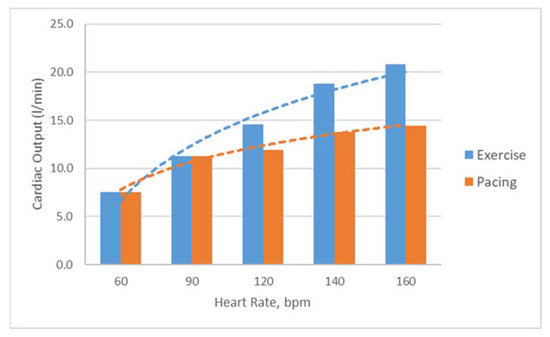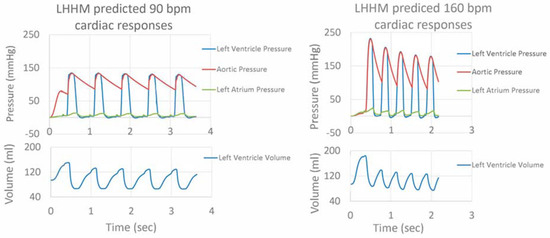 In the LHHM, for a paced heart, cardiac output increases initially with heart rate; as the heart rate goes up (>100 bpm) the rate of CO increase slows down and approaches a plateau; for a heart during exercise, the CO increase continues to become a higher heart rate (Figure 6). These results are in agreement, as reported in the literature [23,24]. Other parameters, such as LV ejection time and filling time, also follow the trend as measured in vivo [21].