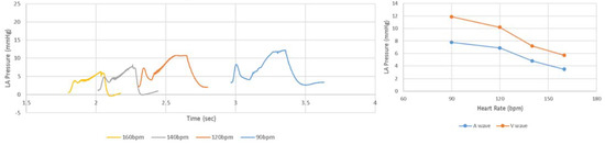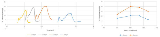 When LHHM is configured to simulate pacing without exercise, the model outputs show that the stroke volume reduces with an increasing heart rate (Figure 4). This result is in agreement with in vivo measurements reported in the literature [22]. Left atrium pressure traces at the fifth cardiac cycle for paced hearts are plotted for heart rates (90, 120, 140 and 160 bpm) and shown in Figure 5. The A wave and V wave pressures keep decreasing from 90 bpm to 160 bpm.