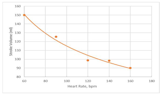 Predictions of stroke volume for paced heart for heart rates of 60, 90, 120, 140 and 160 bpm in orange dots with a trendline fitting the data in orange line.