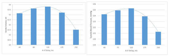 An example is AV delay. AV delay is the delay in conduction between the atria and ventricles at the AV node [6]. AV delay is optimal when the atria have fully emptied before the ventricles contract [7,8,9]. AV delay must be programmed appropriately for each individual patient with dual-chamber pacing [9]. AV delay has been shown to have a significant effect on hemodynamic performance, and improper adjustment of AV delay can reduce cardiac output by lowering the efficacy of the pacemaker, and it can cause the heart to work harder against elevated back pressure, resulting in increased myocardium strains and development of “pacemaker syndrome” [10,11]. AV delay optimization has been well studied; however, the dependence of optimized AV delay on individual patients is still not well understood.
