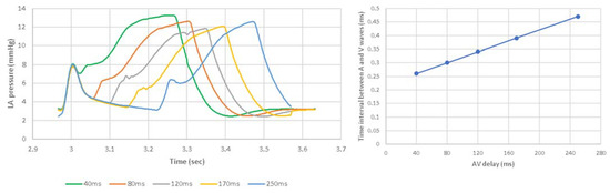 (Left) Pressure time traces for left atrium at the fifth cardiac cycle. (Right) Time interval between the peaks of LA pressures at A wave and V wave with heart rate of 90 bpm and AV delay of 40, 80, 120, 170, 250 ms.