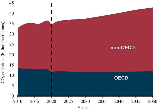 Rapid population growth, industrialization, urbanization, economic growth, social development, and technological advancement have continued to increase energy consumption worldwide. Credible available statistics show that the global primary energy consumption was 109,583 terawatt hours (TWh) in 2000, became 140,562 TWh in 2010, and rose to 162,194 TWh in 2019 []. The International Association for Energy Economics has predicted that primary energy consumption will grow by over 39% over the next 20 years [] while the International Energy Agency predicts more than a 50% increment in global primary energy consumption by 2050 []. The continuous energy demand is premeditated on the importance of the availability of a sustainable, reliable, affordable, and accessible energy supply to the social, economic, and industrial development of any country. However, most of the world’s energy is sourced from fossil fuels. REN21, an international renewable energy policy network, reports that about 80% of the global energy mix still comes from fossil fuels []. Consumption of fossil-based (FB) fuels in the transportation, industrial, agricultural, commercial, household, and power generation sectors has continued to increase despite the efforts to stem the tide by various governments, organizations, and interests. The emission of carbon dioxide (CO2) from energy-related applications is predicted to continue to increase globally. Though the CO2 emissions from the Organization for Economic Cooperation and Development (OECD) countries have remained flat, that of the non-OECD nations are predicted to continue to rise, as shown in Figure 1 []. This trend is not likely to change in the foreseeable future as the share of FB fuels in the transportation sector has been predicted to be no less than 88% in 2040 []. This has led to the release of toxic emissions and other serious environmental degradation concerns and exacerbated global warming and climate change.