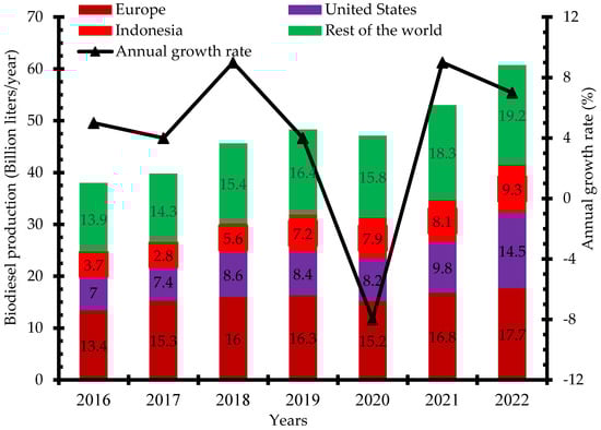 There has been increased research and investment in the production of biodiesel over the past few years to be able to meet up the global demand. Indonesia, the United States, and Brazil are the three leading biodiesel producers in 2019 with 7.9 billion liters, 6.5 billion liters, and 5.9 billion liters, respectively (Figure 2) []. Global biodiesel production increased from 38 billion liters in 2018 to 48.3 billion liters in 2019 and 60.7 billion liters in 2022. The annual growth rate of biodiesel production increased from 4% in 2017 to 9% in 2021. The negative growth rate recorded in 2020 was due to the impact of the dreaded COVID-19 pandemic that restricted movement and slowed down economic activities in most countries (Figure 3) []. Concerted efforts including research and development, infrastructure, policy framework, incentives, and investments have been put in place to ensure the increased production of biodiesel for diverse applications.