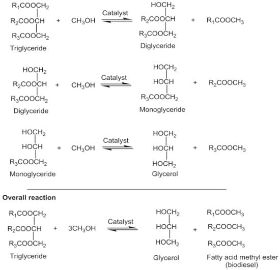 Transesterification, also known as alcoholysis, is arguably the most commonly used chemical method for converting vegetable oil, natural fats, and recovered fats into biodiesel. During the process, three moles of alcohol (methanol or ethanol) stoichiometrically react with one mole of triglyceride in the presence of a catalyst to produce mono-alkyl ester and glycerol. The three steps involved, and the general equation are depicted in Figure 4. The process occurs under moderate operating conditions of about 60–80 °C, ambient pressure, and for 90 min. Other process parameters that affect the transesterification reaction include types of catalyst, a dose of catalyst, catalyst particle size, alcohol/oil molar ratio, residence time, reaction temperature, mixing/agitation speed, choice of alcohol, and composition of oil [].