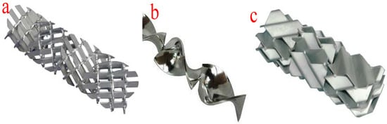 Different configurations of static mixers. (a) X-grid static mixer; (b) helical twist static mixer; (c) corrugated plate static mixer.