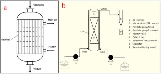 Packed bed reactors, also known as fixed bed reactors, are one of the most used tubular reactors in chemical industries, especially for biodiesel production using heterogeneous catalysts. They can also work in the supercritical mode for improved biodiesel production. During the transesterification process for biodiesel production, the packed bed reactor provides a substrate for enzyme immobilization to improve production. Much more than the size or volume of the reactor, the amount of the solid catalyst in the tube influences the conversion of the feedstock into biodiesel []. The reactors are in tubular forms and the tubes are filled with packing materials including heterogeneous catalysts and activated carbon. The performance of a packed bed reactor is greatly affected by the catalyst particle size, bed structure, and the spaces between catalyst particles. The arrangement of the packing materials is governed by factors such as (i) physical attributes of the tube, (ii) the shape, size, and the surface structure of the catalyst, and (iii) the intensity, method, and speed of deposition []. Figure 9a shows the schematic representation of a packed bed reactor while (b) shows a packed bed reactor for biodiesel production [].