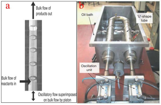 (a) Schematic representation of an oscillatory flow reactor; (b) a typical oscillatory flow reactor for biodiesel production. Adapted from [].