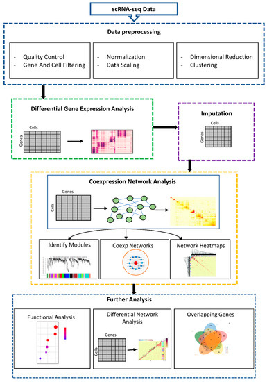 Although there is a rapid increase in available tools to analyze scRNA-seq data, no systematic pipeline comprehensively analyzes scRNA-seq, including constructing a gene coexpression network analysis. There are some accessible packages for GCNs, such as weighted gene coexpression network analysis (WGCNA), coexpression of RNA-seq data (Coseq), and coexpression modules identification tool (CEMiTool), petal, CoXpress, and coexpressed biological processes (CoP) [20]. However, they were initially designed to analyze microarray and bulk RNA-seq datasets [21,22]. Furthermore, these GCNs packages cannot be directly used for analyzing single cells because of the sparse data in the scRNA-seq data. To the best of our knowledge, there is no complete systematic pipeline including all the above analysis procedures.