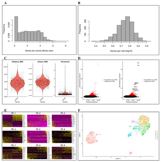 Preprocessing of scRNA-seq data. (A) Measurement of library size for genes per counts; (B) Genes distributions among cells; (C) Quality control; (D) Variable genes in the dataset; (E) Dimensionality reduction heatmap PCA; (F) UMAP clustering of the dataset.
