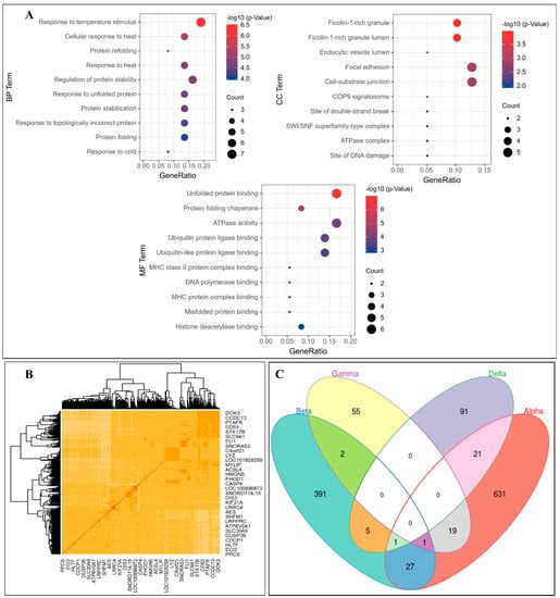 The essential GO terms in the three categories were, respectively, protein folding (GO:0006457) for BP, the cell-substrate junction (GO:0030055) for CC, and unfolded protein binding (GO:0051082) and protein folding chaperone (GO:0044183) for MF. The study of [48] emphasizes that high inflammatory cytokines might induce the accumulation of unfolded or misfolded proteins, i.e., endoplasmic reticulum stress in diabetic pancreatic islets. In the CC category functional enrichment investigation, Zhang et al., 2022 [49] discovered that the upregulated differentially expressed genes concerning acute pancreatitis were connected with the cell–substrate junction. On the other hand, chaperones’ adaptive unfolded protein response signaling maintained endoplasmic reticulum protein folding equilibrium in healthy beta cells, according to Yong et al., 2021 [50]. Figure 6A shows that several of our targeted genes included protein folding terms. We assumed that the BP and MF protein-folding-related GO terms were relevant in pancreatic or diabetes disease. Furthermore, several of our identified genes were enriched for the BP and MF categories, with only a few enriched for CC. The enhanced GO terms may be crucial in revealing the progression of diabetes disease.