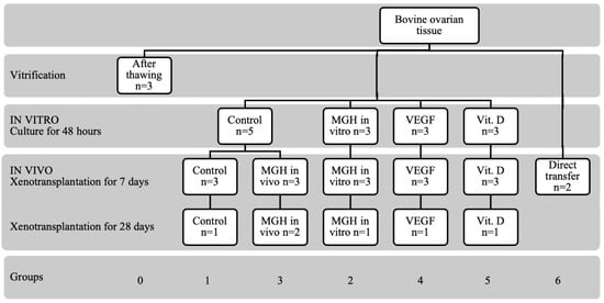 Experimental layout. Cortical fragments of bovine ovarian tissue were cryopreserved, thawed and distributed to each group. Forty ovarian fragments were removed for histological and immunohistochemical analysis at each stage of the study. The number (n) indicates the number of different bovine samples in each condition; all were analyzed in two sections by two independent investigators. MGH, medical grade honey—L-Mesitran Soft® 0.2%; VEGF, vascular endothelial growth factor; Vit.D, vitamin D.