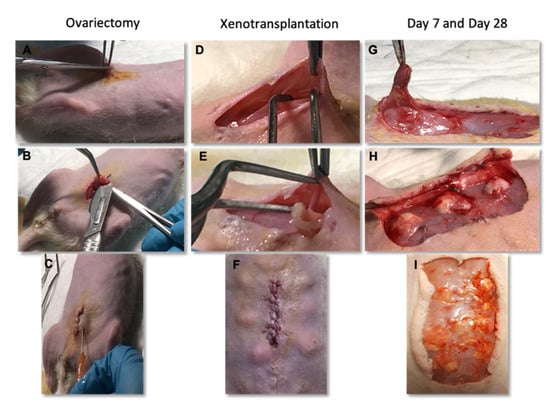 Surgical procedures performed on female Rowett nude rats. For ovariectomy, a longitudinal median laparotomy in the lower area of the abdomen was performed (A), the ovaries were identified and removed (B) and, after abdominal wall suture, they were administrated a subcutaneous analgesia (C). Bovine ovarian tissue was transplanted after a blunt dissection of a subcutaneous pocket (D–F). Fragments were recovered after 7 (G,H) and 28 days (I).