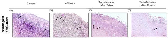 In the context of cell proliferation, L-Mesitran treatments (in vitro and in vivo) showed high levels of Ki-67 expression in stromal cells 7 days after transplantation. It was possible to demonstrate that cell recovery occurs over time when compared to control. These findings are in agreement with the results of Gastal et al., who reached proliferative potential and tissue survivability after 7 days in culture []. Furthermore, several authors [,,] describe the presence of necrotic regions in the first days after transplantation.