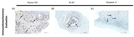 Endothelial cell density was evidenced by immunostaining with anti-FVIII antibody (Cell Marque 760-2642, Bio-Rad Laboratories, Hercules, CA, USA), which is validated for microvessel staining [] (Figure 4). Factor VIII is a glycoprotein exclusively synthesized by endothelial cells, specifically in Weibel-Palade bodies, and megakaryocytes. It usually binds to the von Willebrand factor, regulating the adhesion of thrombocytes to subendothelial connective tissue []. To evaluate cell proliferation and apoptosis, staining with anti-Ki-67 (PA5-19462, Thermofisher, Waltham, MA, USA; Figure 4) and anti-Caspase-3 (AHP2286, Bio-Rad Laboratories, Hercules, CA, USA; Figure 4) antibodies was performed, respectively. Briefly, blade dewaxing was carried out by heating to 72 °C, followed by cell conditioning (cc) and ultra CC, for 3 cycles. Next, preprimary peroxidase inhibitor was added to the primary antibody by heating the blade, followed by the application of a drop of anti-Caspase-3 antibody (1/100), anti-Ki-67 antibody (1/300) or anti-FVIII antibody (1/300) and incubation for 36 min. After this, color optimization reaction occurred using the Optiview system (OptiView DAB IHC Detection Kit, Ventana Medical Systems, Tucson, AZ, USA) and incubation with peroxidase HRP Multimer for 16 min. Finally, a drop of haematoxylin and a drop of bluing reagent (postcontrast) were applied with an incubation period of 4 min.