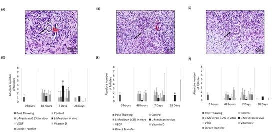 The number of primordial follicles was significantly higher in the L-Mesitran group in vivo 7 days after transplantation than in the other groups (p < 0.01) (Figure 5A,D). Regarding primary follicles, higher numbers were observed in fragments treated in vivo with L-Mesitran, 28 days after transplantation (p < 0.03) (Figure 5B,E). No significant differences were obtained for the number of secondary follicles (Figure 5C,F).