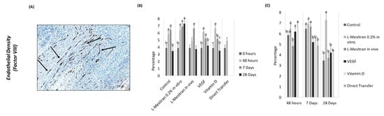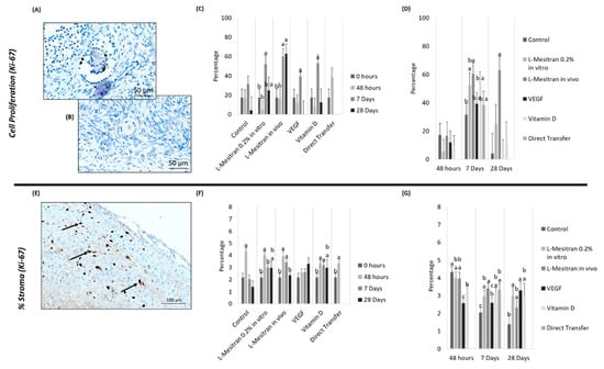 Stromal labelling with anti-Ki-67 was also evaluated (Figure 7E). At 48 h, the VEGF group had a lower value than the control and the L-Mesitran in vitro and in vivo groups (p ˂ 0.003). The vitamin D group was also inferior to the control group (p = 0.013). At day 7, Ki-67 marking was higher in all groups in relation to the control (p < 0.05), except for the treatment of VEGF; the L-Mesitran in vivo group was superior compared to VEGF (p = 0.048) (Figure 7G). Finally, at day 28, a higher cell proliferation marking was evident in the L-Mesitran in vitro and VEGF groups compared to the control group (p = 0.0026 and p = 0.0077, respectively) (Figure 7G).
