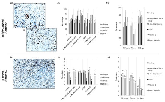 Conversely, stromal labelling by anti-Caspase-3 antibodies show several significant differences between groups and over time (Figure 8E–G). At 48 h, the vitamin D group had a higher percentage of stroma marked with Caspase-3 (p < 0.01), except in comparison with the L-Mesitran in vitro group (Figure 8.G). At day 7 after transplantation, the L-Mesitran in vivo group displayed higher values compared to other groups (p < 0.02), except for the L-Mesitran in vitro group. Similarly, at 28 days, the L-Mesitran in vivo group showed the highest percentage of stromal labelling (p < 0.001) (Figure 8G).