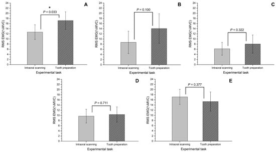 The present preliminary in vivo study has several limitations. First, the following variables were not considered during the simulation: postures, other than sitting, for treatment; various types of teeth involved in tooth preparation tasks; and types of high-speed dental handpieces and intraoral scanners. The mannequin used in the present study was difficult to reflect the patient’s oral environment. In actual clinical practice, the oral cavity does not remain fixed even if the patient cooperates. Moreover, the muscle tone associated with the presence of temporomandibular joint disorder can affect the degree of opening of the mouth, which can affect the dentist’s posture. This is a preliminary in vivo study, which has limitations in experimental configuration, and the findings should be further verified through additional studies. Second, although the sample size was determined by referring to a previous study [], the present study included a small number of participants (six participants). In the present study, various factors were controlled for, and only participants who had a high willingness to participate, were very cooperative, and had a high understanding of its purpose were included. In addition, it is difficult for participants recruited in the present study to represent the results of various age and sex groups []. With increasing age, musculoskeletal disorders may increase, which may affect muscle fatigue and activation during certain activities. Finally, factors that may affect fatigue and muscle activation during work activities were not considered: subjective working positions, vision, practitioner parafunctions and bad habits, type of services performed, daily working hours, individual physical activity, degree of experience in the use of specific dental equipment. Conversely, a long-term clinical trial should be conducted by increasing the number of participants.